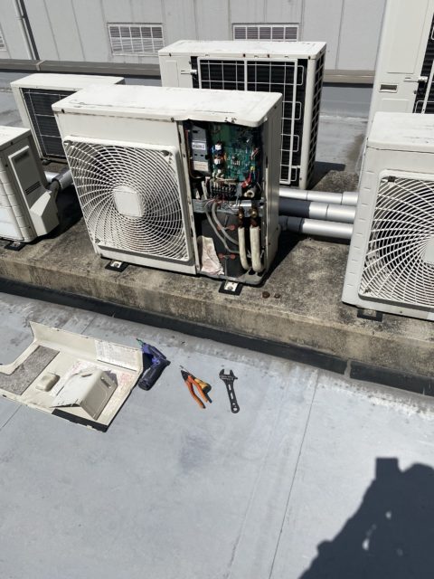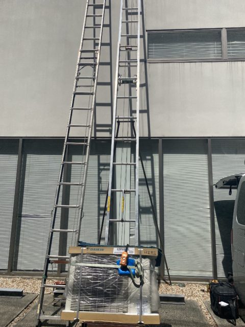 とっかかりは部屋の養生から 既設の室外機を昇降機にて下ろす ユニック車だとスペースが必要なんで今回は梯子用昇降機で施工!