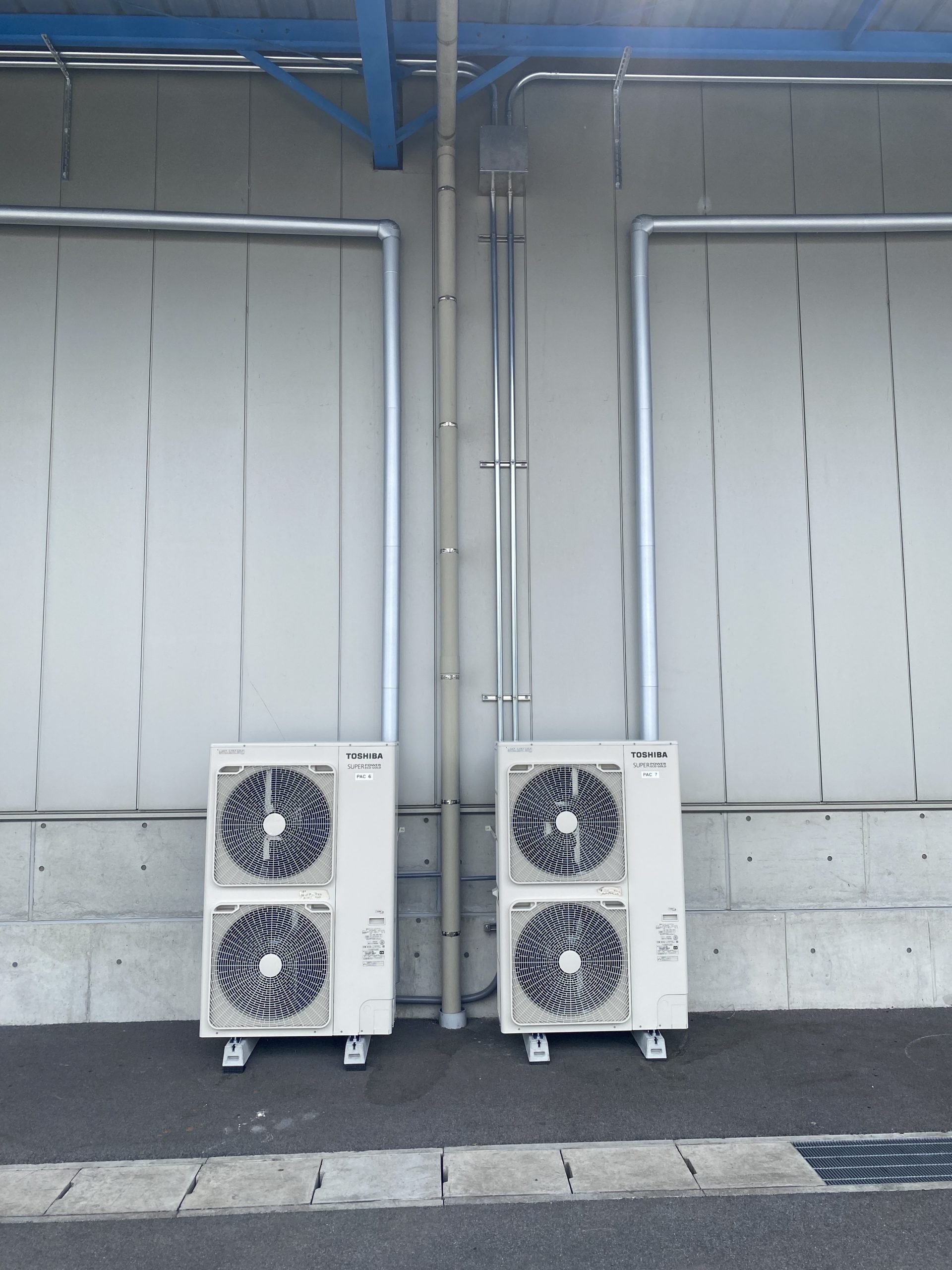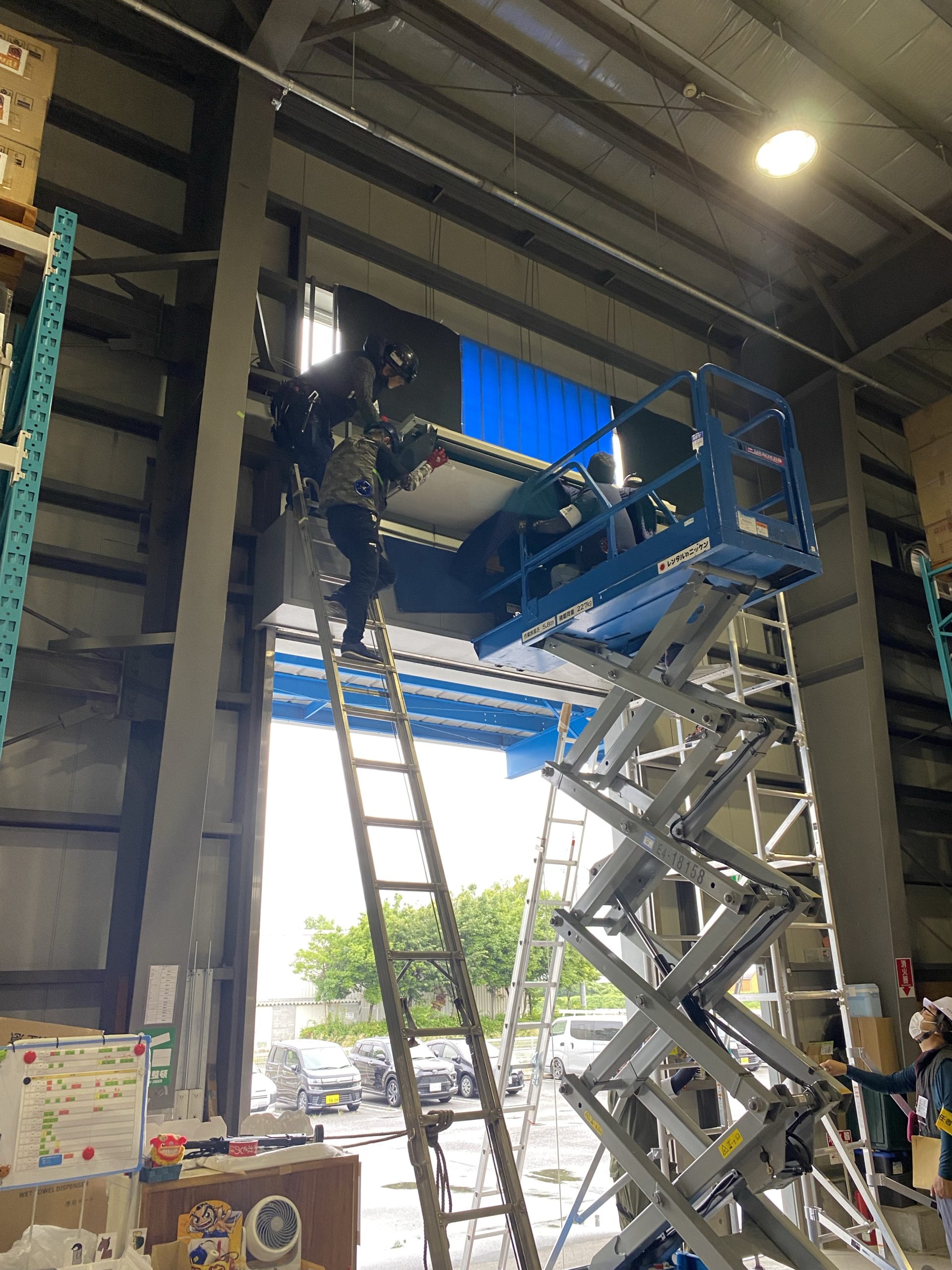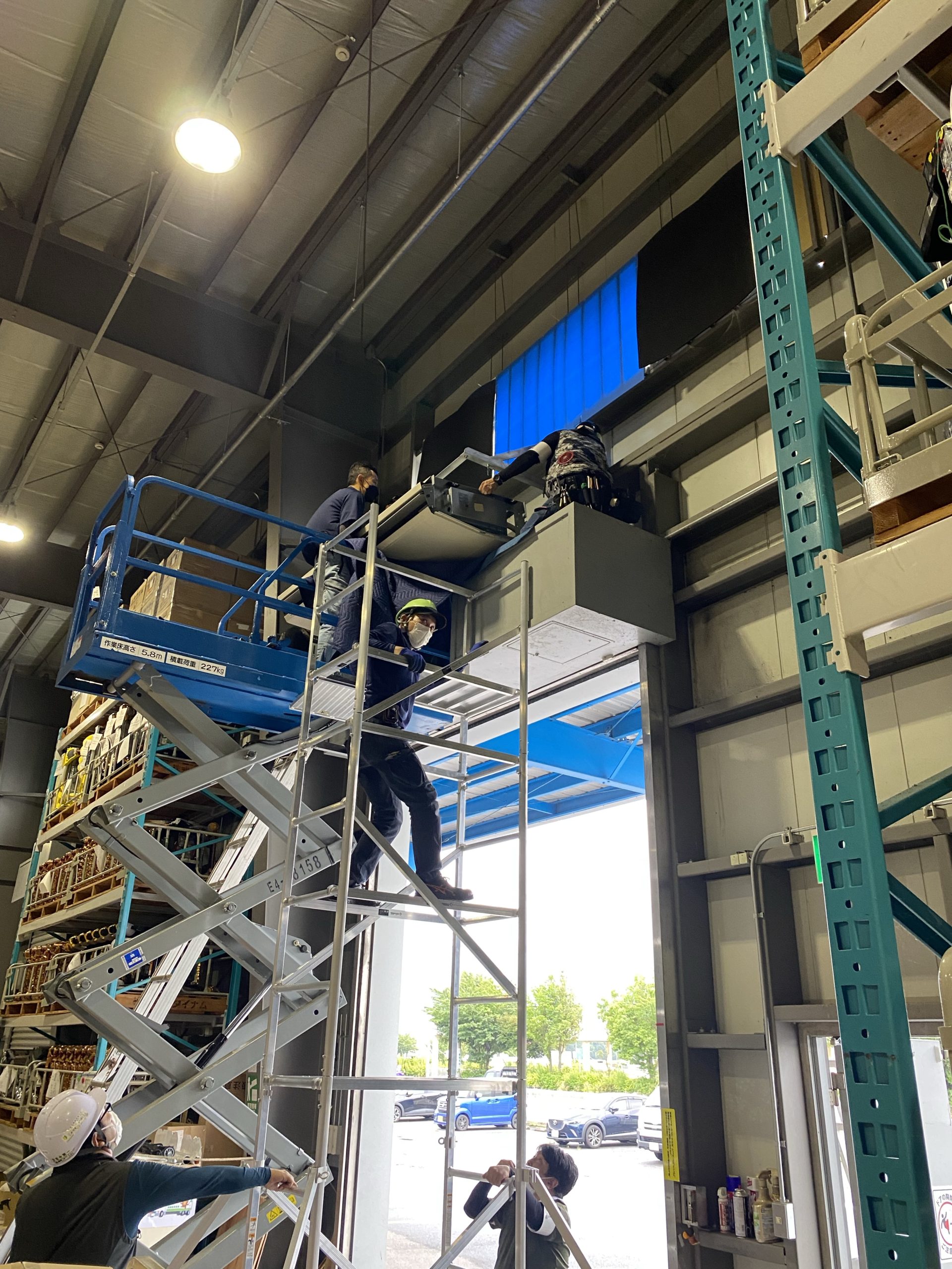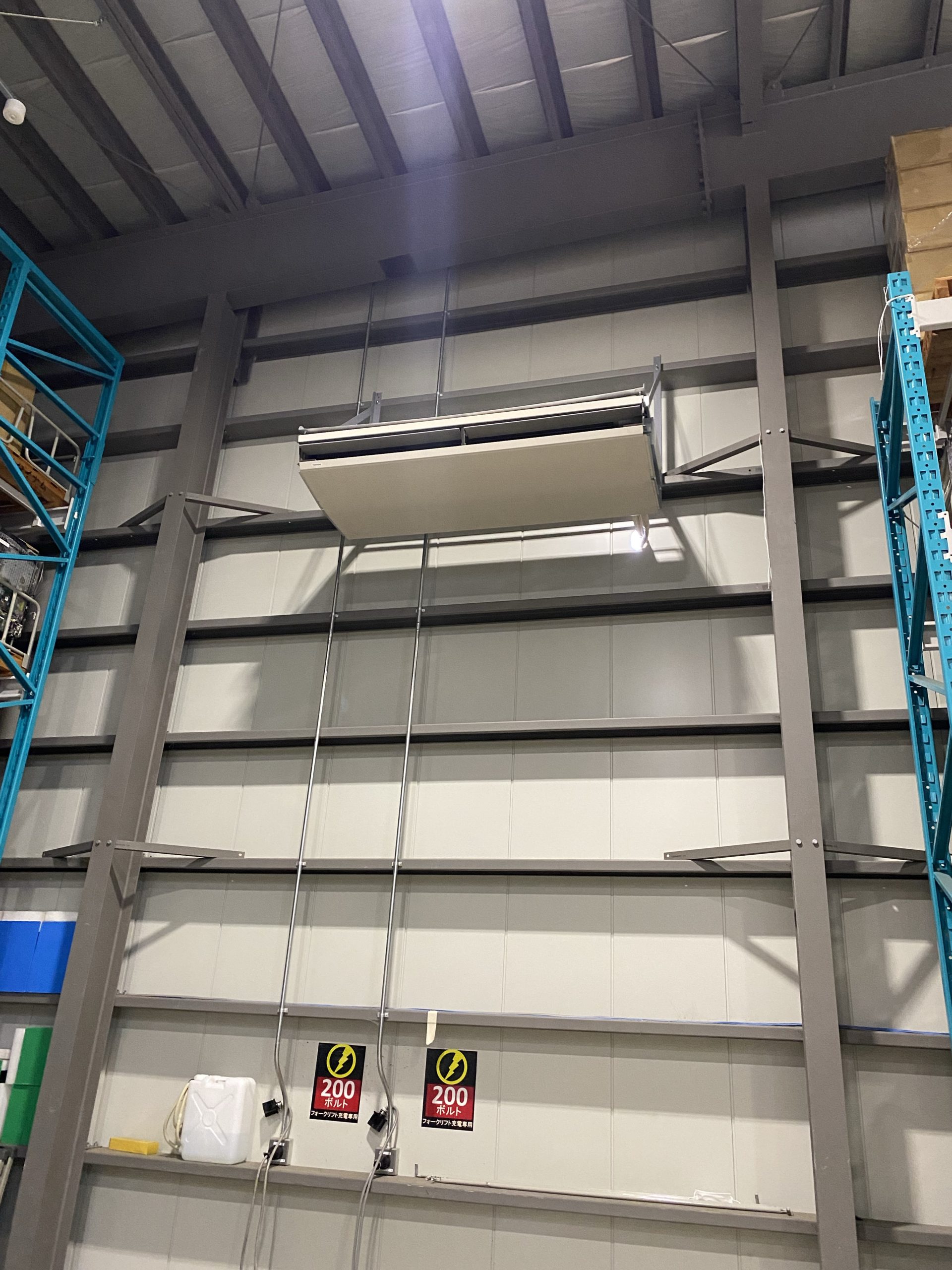 工場内10馬力の天吊りを5mの壁面に取り付け